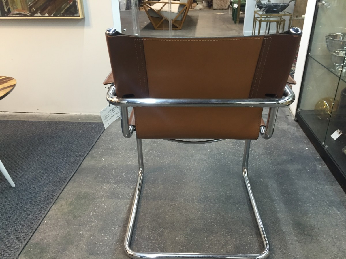 Italian signed chair with brown leather and chrome. Tubular steel construction with double stitching. This chair is very comfortable to sit for reading or conversation. Condition is very good with some light scratches in the leather. The chrome has very light wear. This looks amazing with mid century modern or period antiques. The chair size is 23.5″w * 22″d * 31″h. Inventory #A2, $385.00, Booth MLW in FCDC SOLD