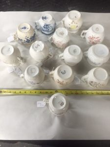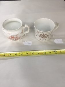 Decorative ironstone cups to fill your shelf’s and cabinets. These vintage mugs will make a perfect addition if you love Victorian, Shabby chic, and cottage style. Most are decorated with transfer ware patterns of flowers and swags. The majority are marked on the bottom with various makers from England and U.S., circa 1870-1890’s. They all have some wear to be expected for use and age. These cups range in price between $15.00 and $25.00.