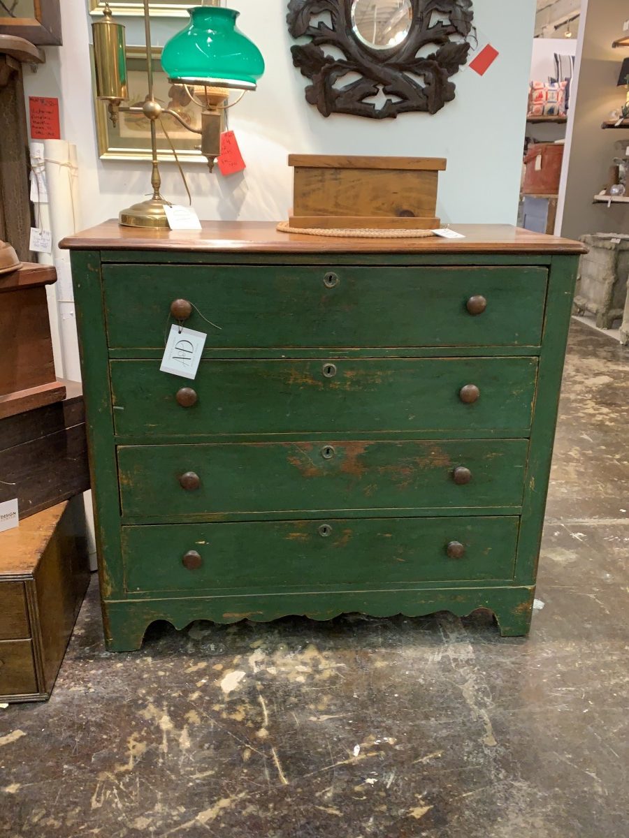 Now available in my booth is this painted chest of drawers. Antique Green 4 drawer chest is perfect for storing clothes or linens. The wood top and handles compliment this 100 year old hunter green painted finish. Designers pay top dollar to re-create this finish that is on this chest. Buy it to decorate a bedroom, foyer or hallway for a pop of green color. Follow me at Instagram@mwrightvintage