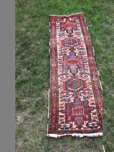 True Persians are made of fine wool which is dyed from minerals and vegetables. This jewel is almost a 100 years old. It’s from Iran with its label on the back. This is a classic Heriz design in very good condition. When you walk around this rug, it will have a light side and dark side. The color and look will change. This is because the way the pile of wool is knotted and lays flat in one direction. Also, the coloring will vary, notice the pink color has various shades. This is a hallmark of natural dying.