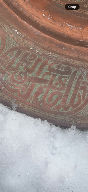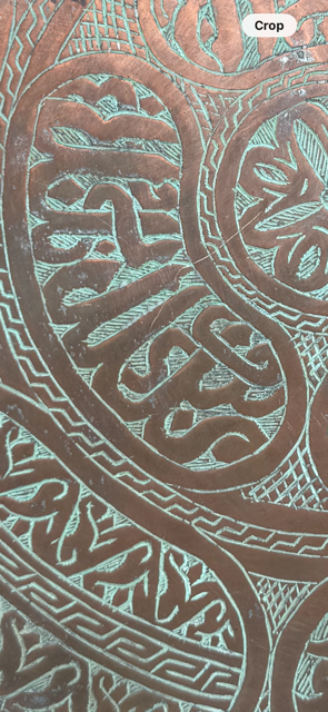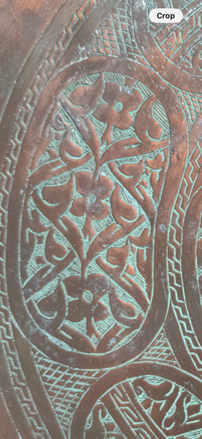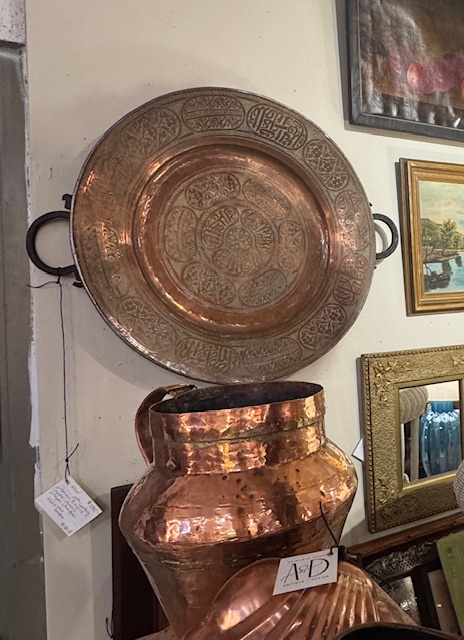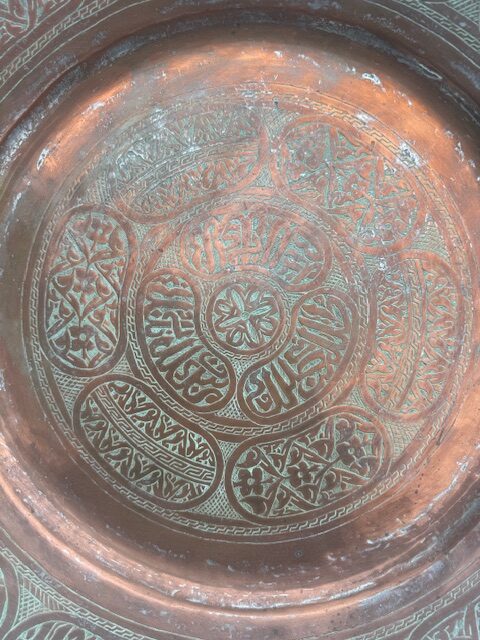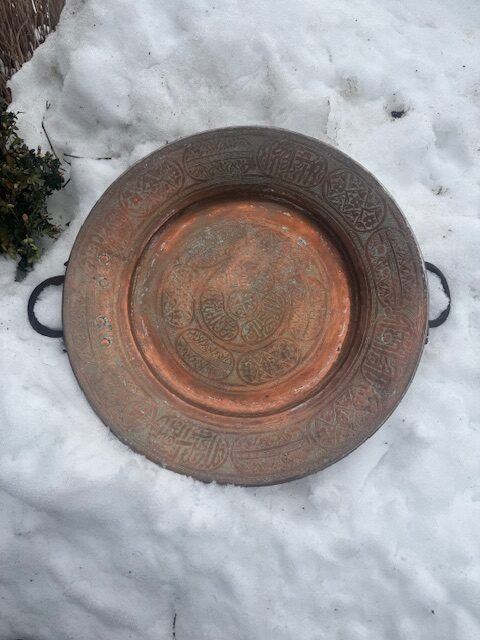 Large and impressive 24-inch round copper charger from the 19th century Ottoman Empire, featuring beautifully engraved Arabic prayer calligraphy framed by flowing floral vine panel decoration. Handcrafted with remarkable detail, this antique piece reflects the artistry of Ottoman metalwork. Fitted with side handles, it creates a dramatic wall display and serves as a striking statement in any collected interior. 29″w with handles, 24″ round. Purchase and pick up at the store only. No shipping