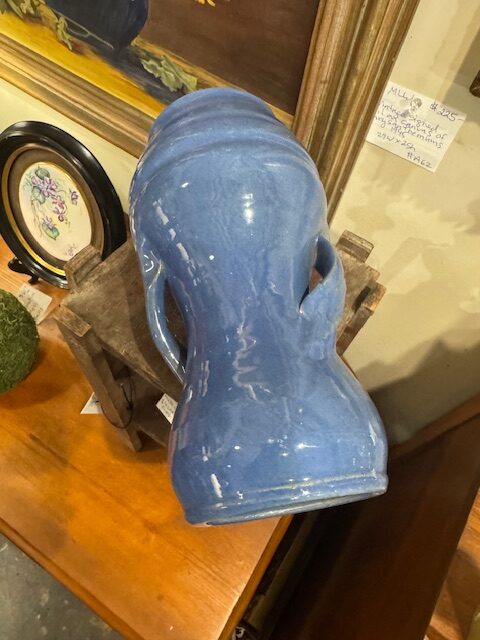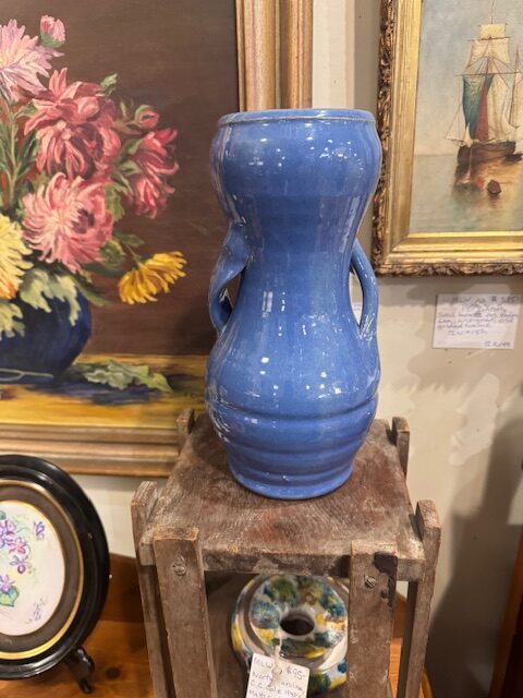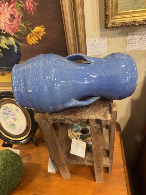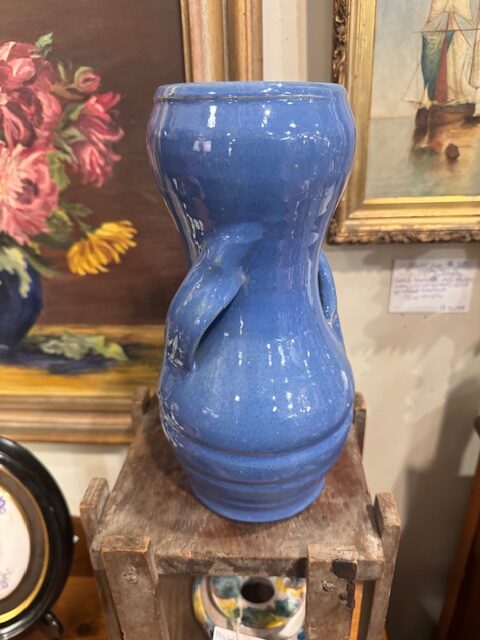 1930s Art Deco vase, handcrafted by the Cole family, seventh-generation potters from North Carolina using early Whitfield clay deposits (white clay). This striking blue-glazed piece stands 10.5” tall and features Cole’s signature twisted molded handles, highlighting their mastery of form and detail. A Southern decorative arts pottery family reflecting decades of tradition and artistry. Perfect for collectors of American pottery, Art Deco design, or historic Southern ceramics. This vase can be purchased and picked up at the store. No Shipping.