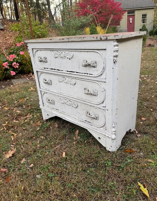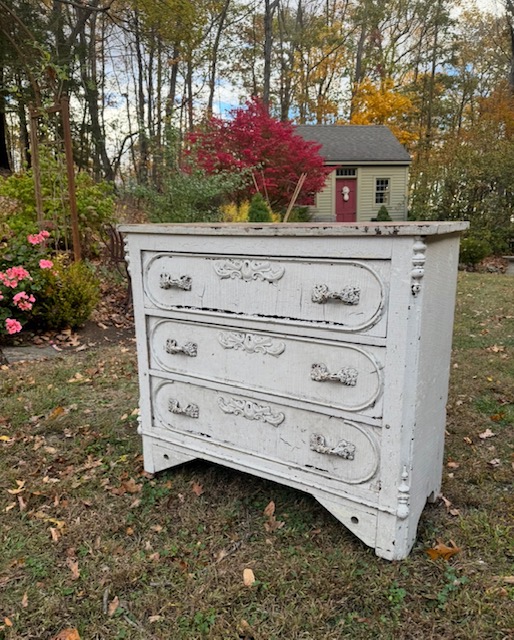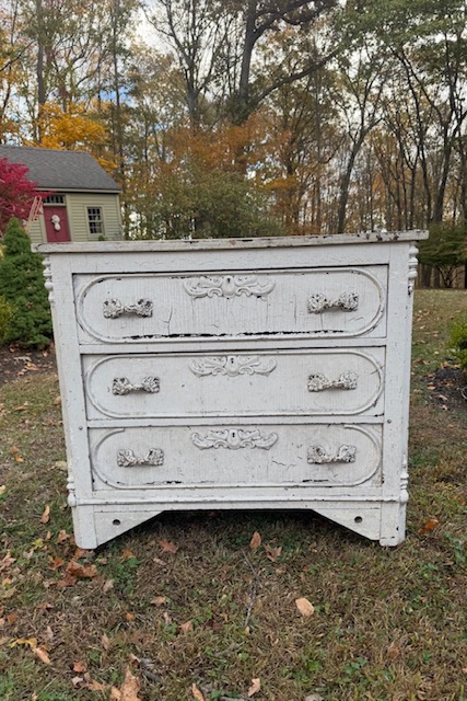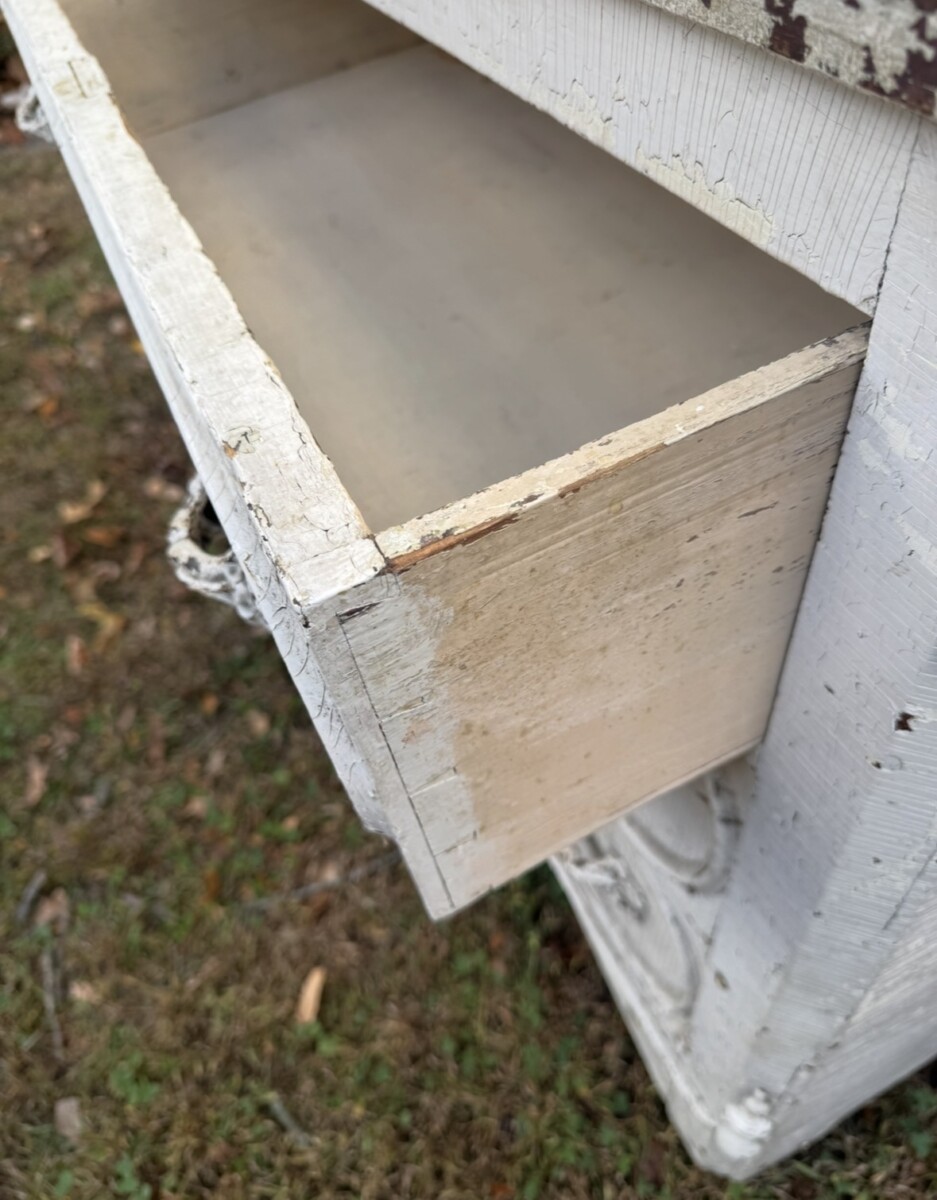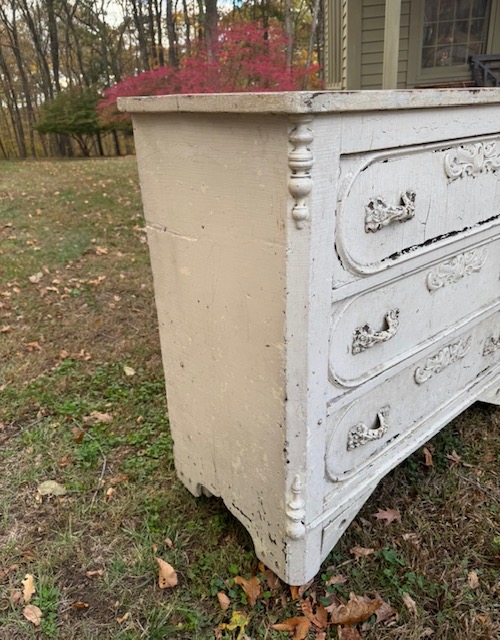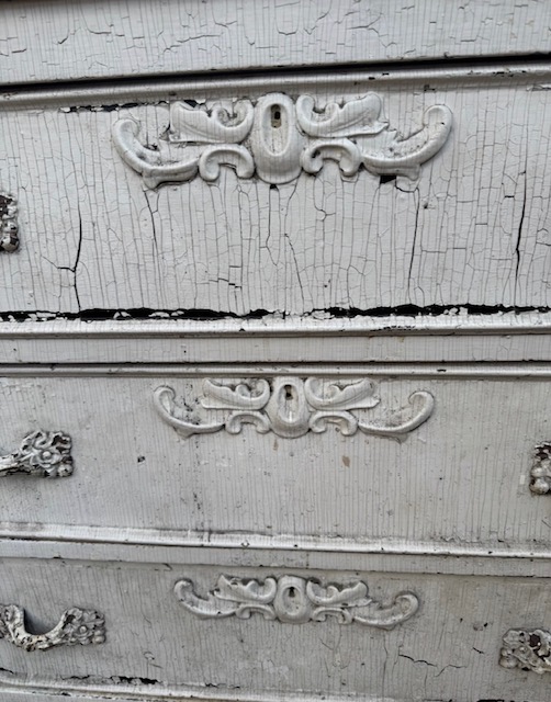 Charming chippy white four-drawer chest with Louis XV–style metal hardware. Wood molded, corner cornice and floral flourish detailing give the piece soft movement and depth. A scrubbed natural wood top adds warmth and contrast, showcasing age and patina. Ideal as a bedside, entry, or storage piece with relaxed European character, well suited to vintage, French country, or modern rustic interiors. 41″w x 17 3/4″d x 37 1/2″h Purchase and pick up at the store.