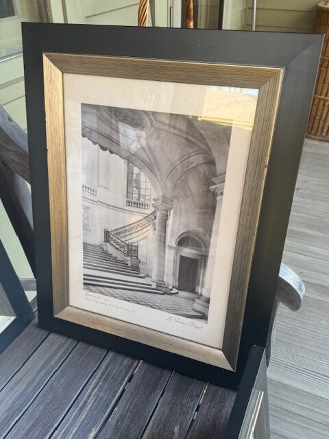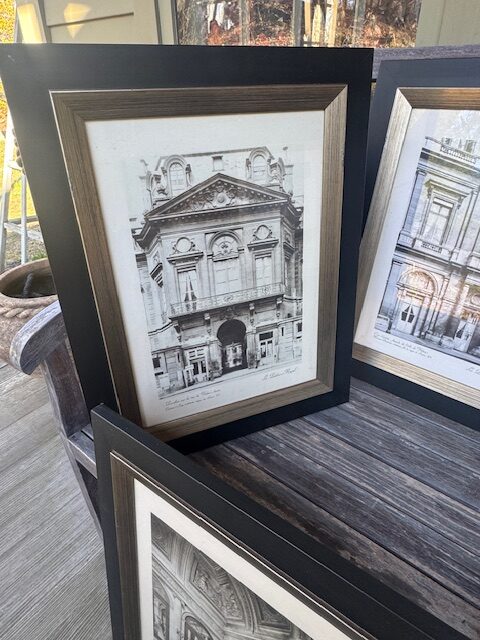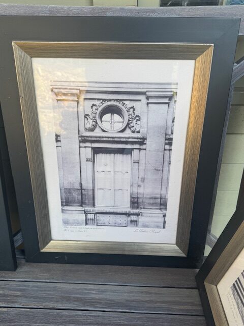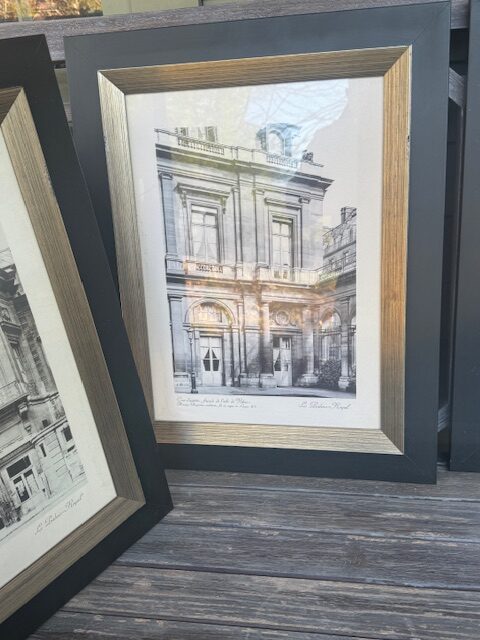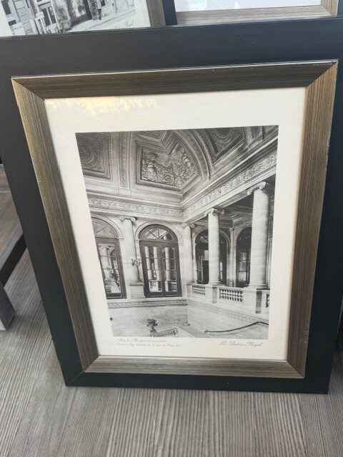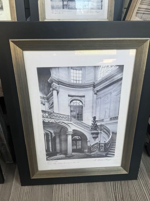 Vintage French architectural black and silver framed photograph prints featuring romantic buildings and interiors. Each piece captures timeless European detail and atmosphere with refined elegance. Ready to hang, they create an instant wall gallery perfect for bedroom, office, hallway, or living room décor. A sophisticated blend of historic charm and modern minimalist styling for any interior space. 18 1/4″w x 23 1/2″h Purchase and pick up at the store only. No shipping.