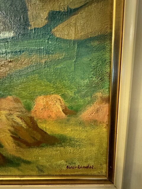 Danish landscape vintage oil painting is for sale in my shop. This oil painting is large and colorful by Eiler Londale (1887-1971). There is so much technical skill in this art work. The painting is very expressive with color theory, form and very modern. The label on the frame notes the artist and this is a landscape of Silkeborg, Denmark. This work was created during the 1940-1950’s. This painting can be purchased and picked up at the store. 28 1/2″w x 24″h