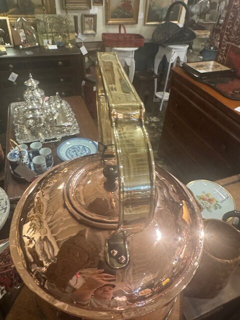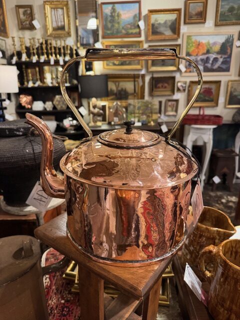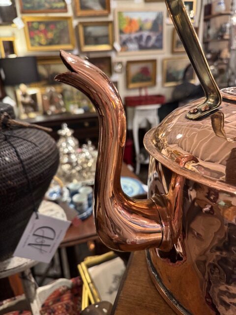 This impressive late 19th-century English copper kettle features a sturdy brass handle and charming goose spout, reflecting traditional Victorian craftsmanship. Large and heavy, it was originally used for heating water in historic homes. Professionally high-polished, it gleams beautifully, making it a striking decorative piece that adds authentic vintage character and elegance to any kitchen or display setting. 14″l x 10″w x 14 1/2″h. Purchase and pick at store only. No shipping.
