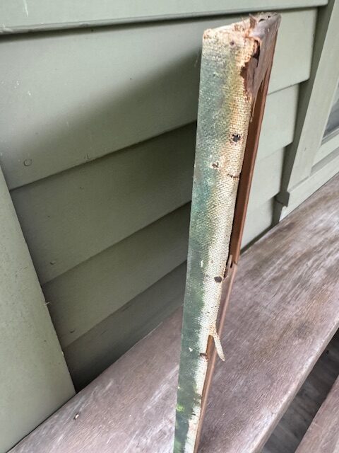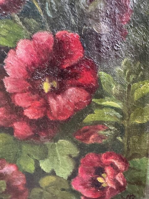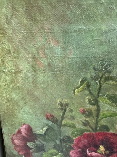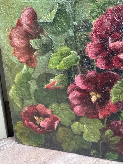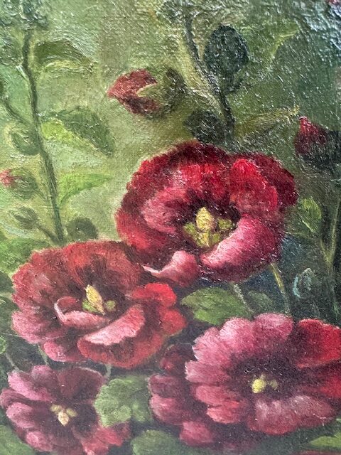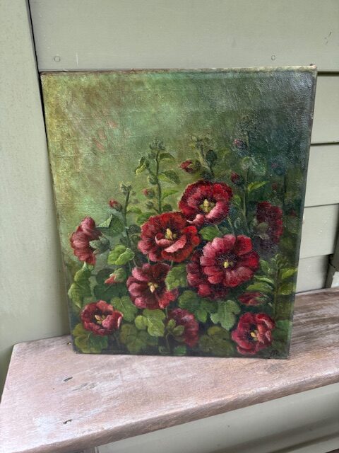 This early 20th-century unframed stretched canvas Danish oil on canvas features lush Hollyhock red and burgundy flowers with subtle shades of green. The artist has talent with color theory, lighting, and brush strokes. The artist has initialed this painting in the lower right corner. Having this painting is a beautiful way to bring the feeling of a garden indoors. 11 1/2″w 14 1/2″h #B56 This Danish Holly Hock floral oil painting can be purchased and picked up at the store.