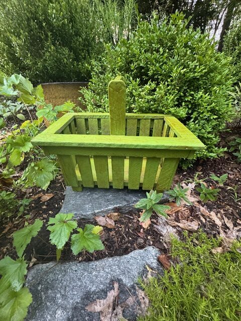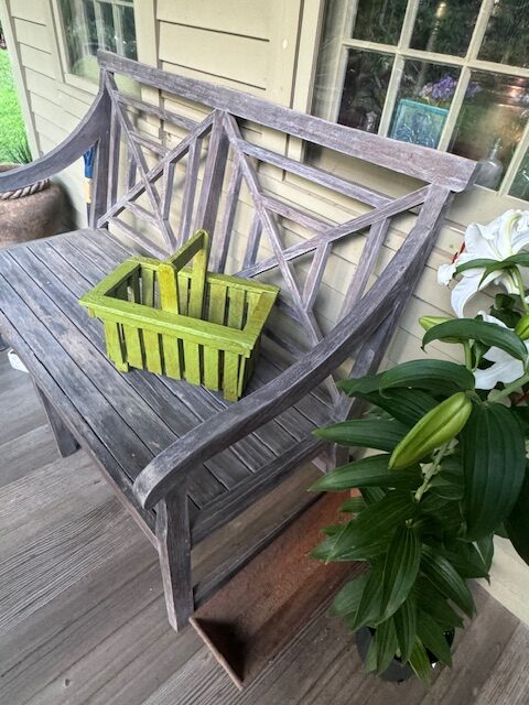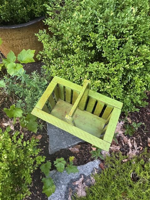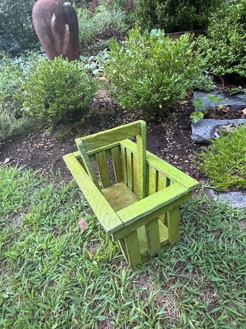 Whimsical and charming, this vintage hand-made wooden planter features a classic picket fence style and a cheerful green painted finish. Perfect as a quirky garden accent, it adds personality to porches, patios, or potting sheds. Use it to display potted plants, store garden gloves, or tuck away small tools with rustic flair and functional charm. 16″l x 10″w x 13″h #D31 This vintage garden carrier can be purchased and picked up at the store,