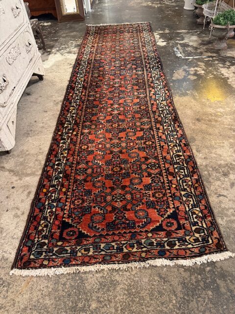 Vintage handmade Persian Iranian Hamadan tribal wool runner showcasing a classic Herati floral center panel, framed by a border of floral and geometric tribal “protection” symbols. Woven entirely of wool, this runner is both durable and richly textured. Authentic tribal design and skilled craftsmanship give it timeless character, making it a future heirloom that adds warmth, history, and understated elegance to any hallway, bedroom, office and reading nook. 32″w x 120″l or 2’8″ x 10′ Purchase and pick up at the store.