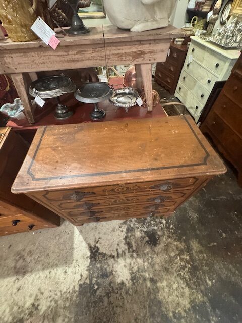 Charming Victorian small four drawer chest featuring hand painted faux wood grain accented with delicate floral flourishes. Compact in scale, it offers practical storage without overwhelming a space. Ideal for a bedroom, guest room, or as a distinctive nightstand. Original surface shows age appropriate wear, adding character, warmth, and authentic period appeal to this decorative yet functional antique piece with subtle Victorian craftsmanship throughout visible. 39″w x 17 1/2″d x 33 1/2″h Purchase and pick up at store.