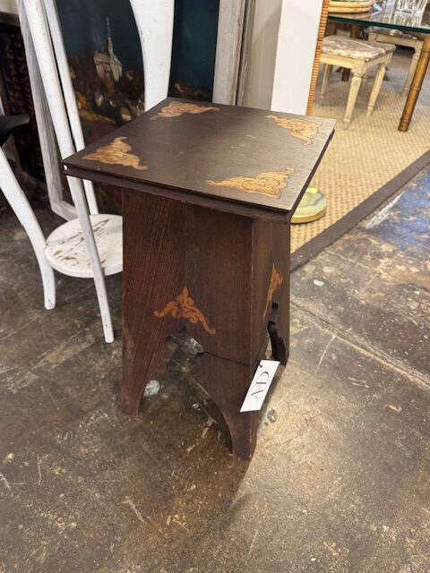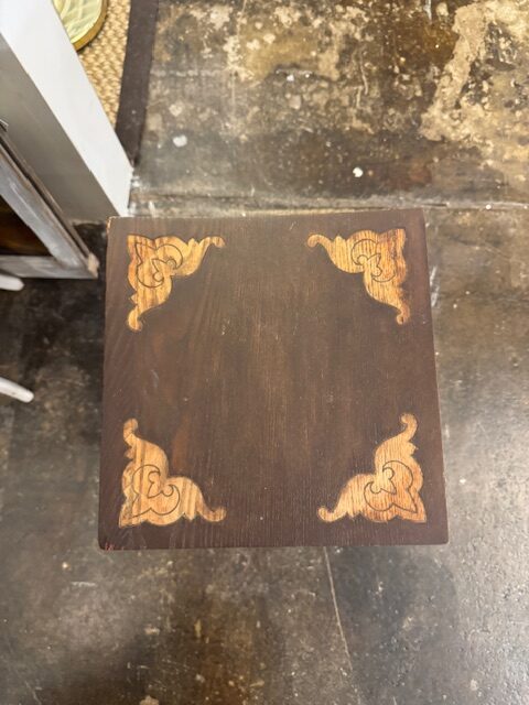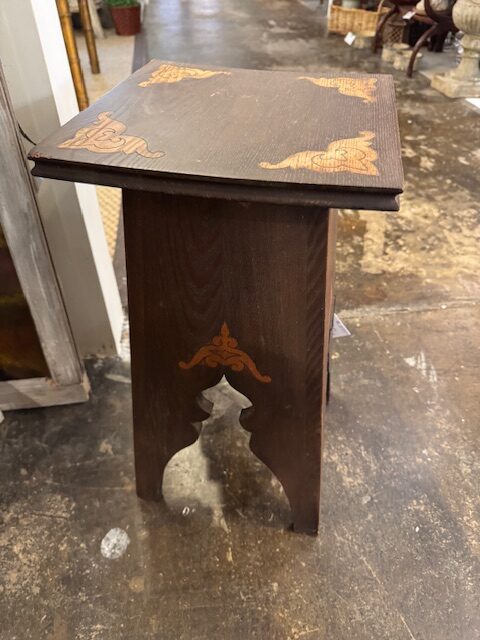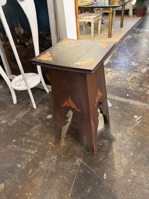This exquisite Arts & Crafts small table showcases handcrafted elegance with a unique Moorish-Arabic design. Solid wood construction features intricately cut-out legs with delicate flourish details, highlighting skilled artisan workmanship. Perfect as an accent or display piece, its warm tones and decorative carvings bring a timeless, handcrafted charm to any room, blending function with ornamental beauty. This small table can go anywhere you will a place for a drink or a book. 11″w x 21″h Purchase and pick up at the store only. No shipping.