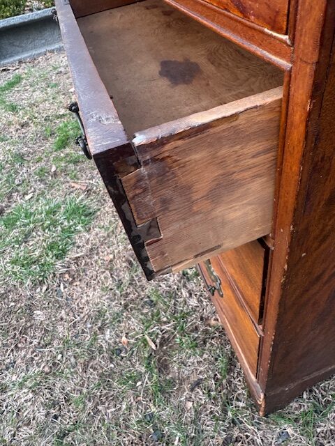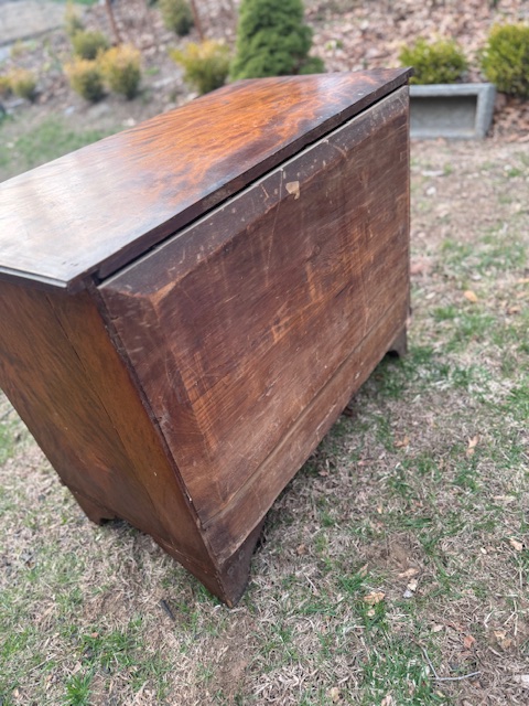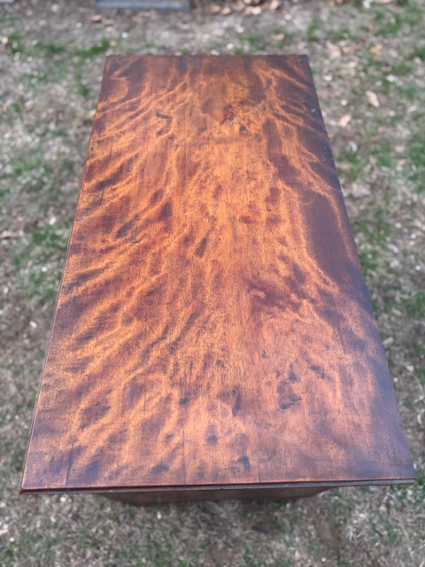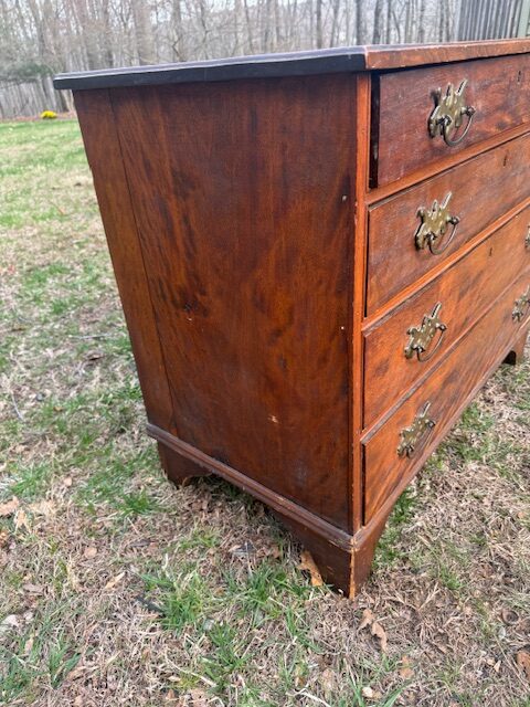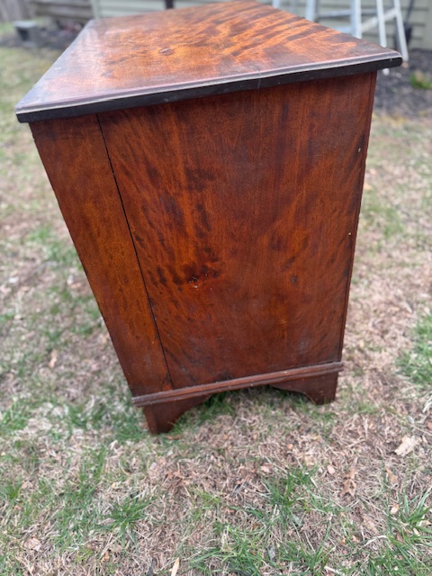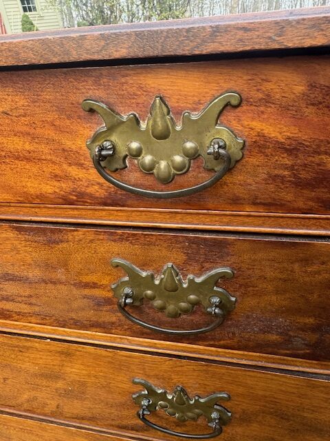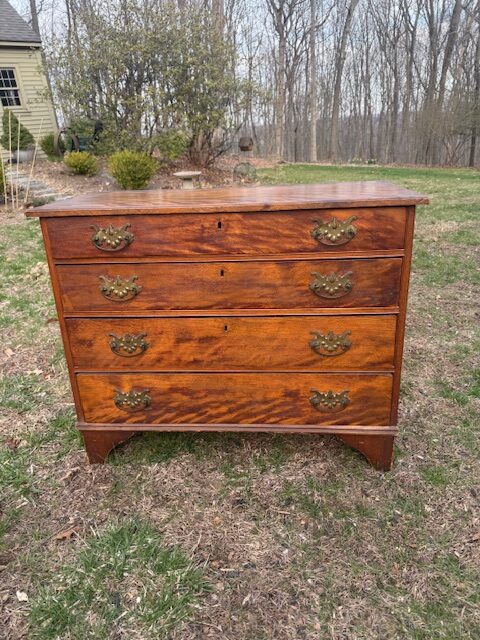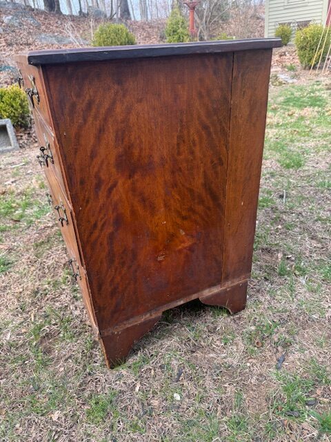Late 19th century four drawer chest in flame mahogany, showcasing striking figured grain and rich warm tones. Outfitted with original brass bat wing pulls, it reflects refined craftsmanship and period elegance. Its compact form makes it perfect for a hallway chest or as a distinctive nightstand, offering both practical storage and timeless decorative presence in any interior setting. Please note this is antique and it has scratches and knicks with trim missing on one side. 38″w x 19 1/2″d x 30 1/2″h Purchase and pick up at the store only. No shipping.