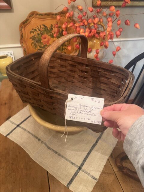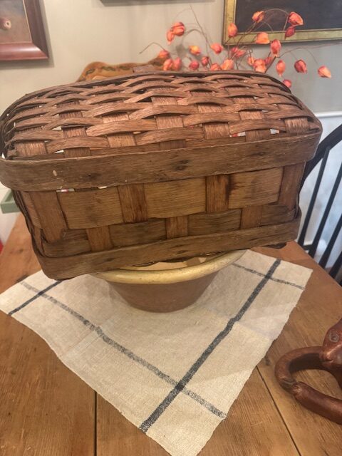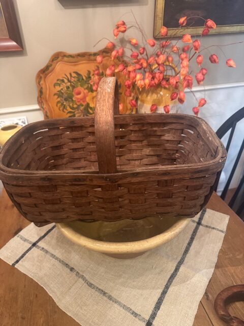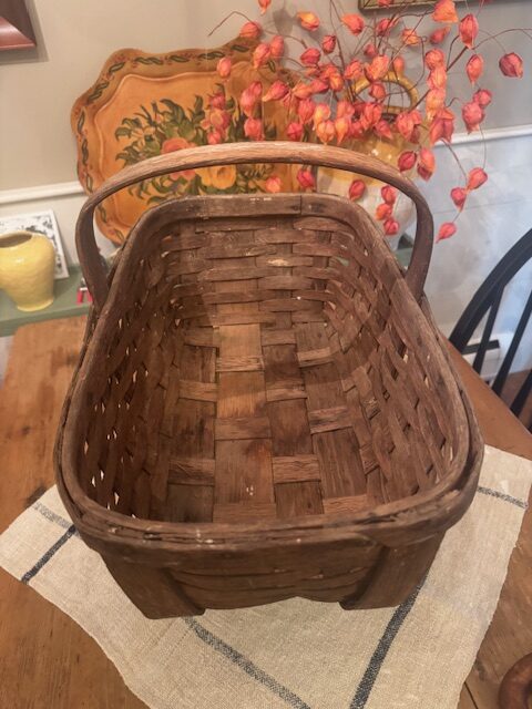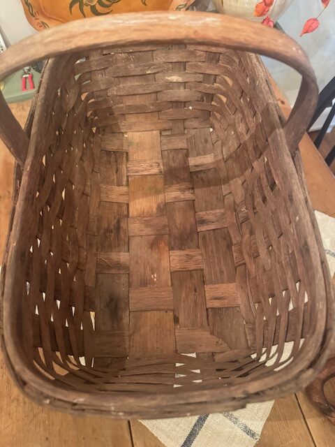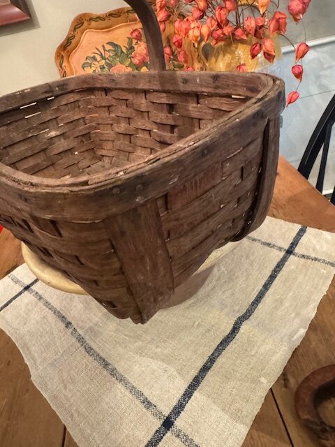Antique handmade oak splint woven kitchen basket, crafted with sturdy banded construction. From a New Hampshire farm, it was traditionally used to sell fresh asparagus at a farm stall. The basket’s solid form, natural patina, and functional design make it a charming example of early American farm craftsmanship, perfect for display or practical use in rustic and farmhouse décor. 18 1/2″l x 11″w x 11 1/2″h Purchase and pick up at the store only. No shipping.