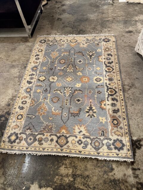 Oushak vintage design wool rug, 48” x 69”, featuring a soft palette of gray, cream, and gold with classic large-scale motifs. Made from soft wool and crafted in Turkey, it offers relaxed elegance and an inviting texture. Ideal for a bedroom, living room seating area, office, reading nook, or layered in an entryway, this versatile rug brings warmth, history, and understated sophistication to any space. Purchase and pick up at the store.