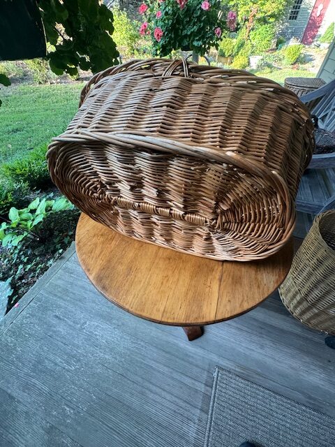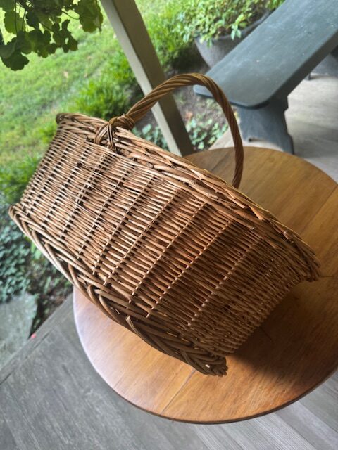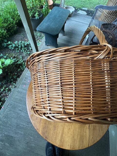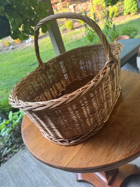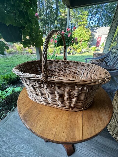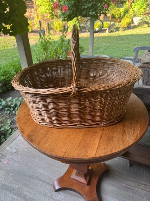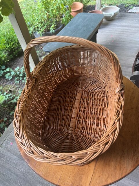 Generous oval French market basket, handwoven from natural wicker, featuring a distinctive thick, overlapping Madeira-style braided edge—an unusual and striking detail. Balanced proportions with a mellow, warm finish give it understated elegance. Perfect for display, storage, or everyday use, this charming basket combines rustic craftsmanship with functional design, bringing a touch of European farmhouse charm to any home. 22″l x 15″w x 15″h Purchase or pick up at the store only. No shipping.