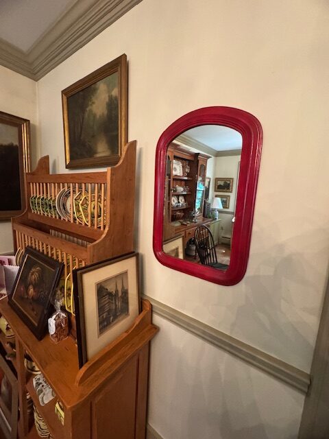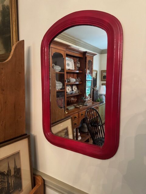 This dome shaped mirror was popular in the mid to late 19th century. This charming mirror is made from solid walnut wood and painted Red later on. This mirror size is ideal for hanging in an entryway, powder room, hallway, or above a small console. Its eye-catching accent in both traditional and eclectic interiors. #A25 17″w x 26″h This Red painted mirror can be purchased and picked up at the store.