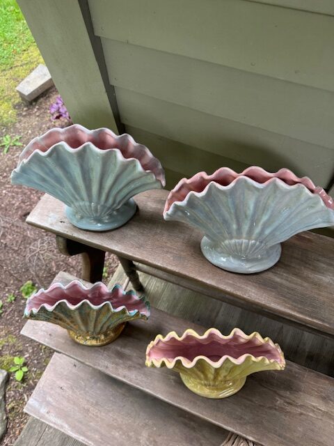 Shell shaped vintage pottery vases are for sale in the shop. These shell vases are unique and whimsical, made by the Gonder company circa 1940-1947 in Zanesville, OH. Gonder J60 were experimental designs with Art Deco and Modern influences. The finishes of Pearl iridescent and Gold were unusual. 11 3/4″w x 4 1/2″d x 8″h These can be purchased and picked up at the store. #44ABCD